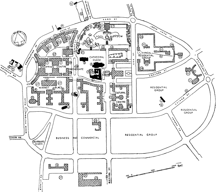 The plan (right) shows work which can proceed immediately after the war. The buildings and sites marked black are either historically interesting or recently erected, and for this reason it is proposed that they shall remain. The areas tinted show new work which is proposed after the necessary demolition and site clearance has taken place. Much of this area is already scheduled for slum clearance.